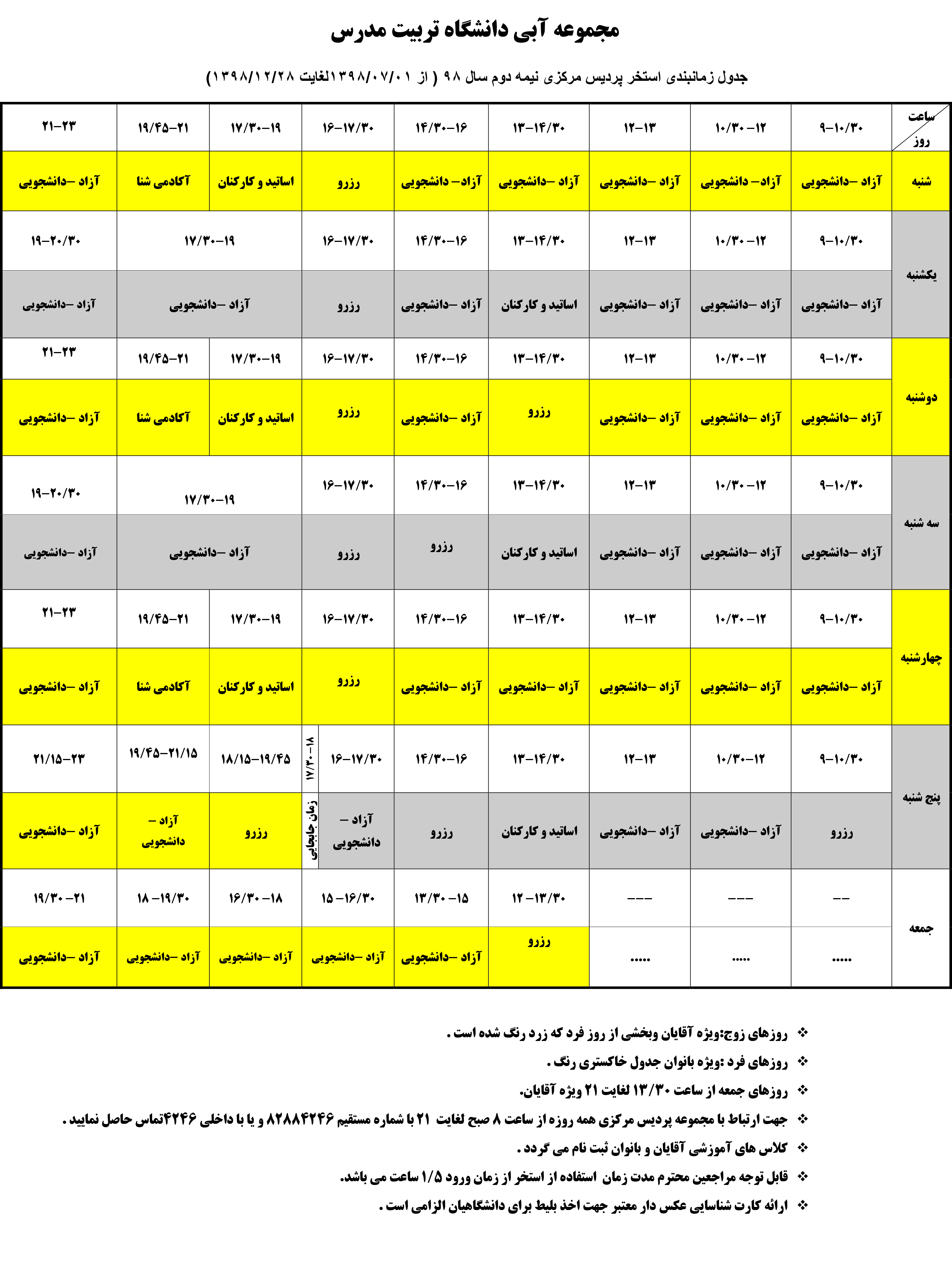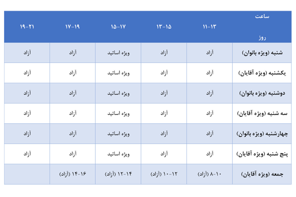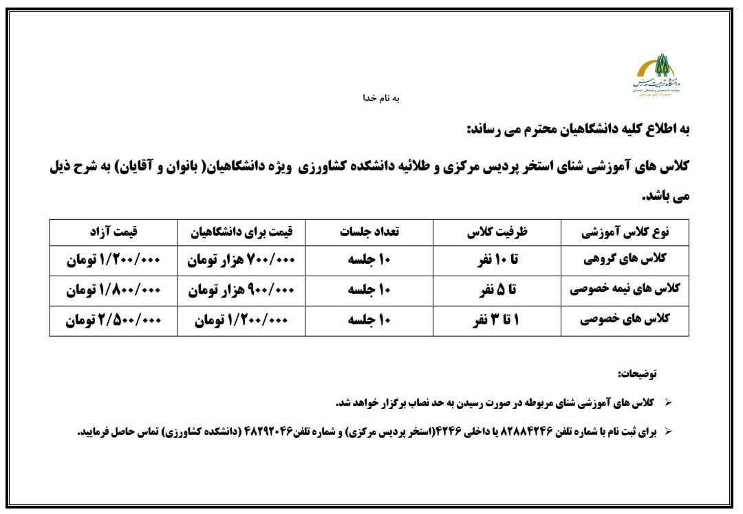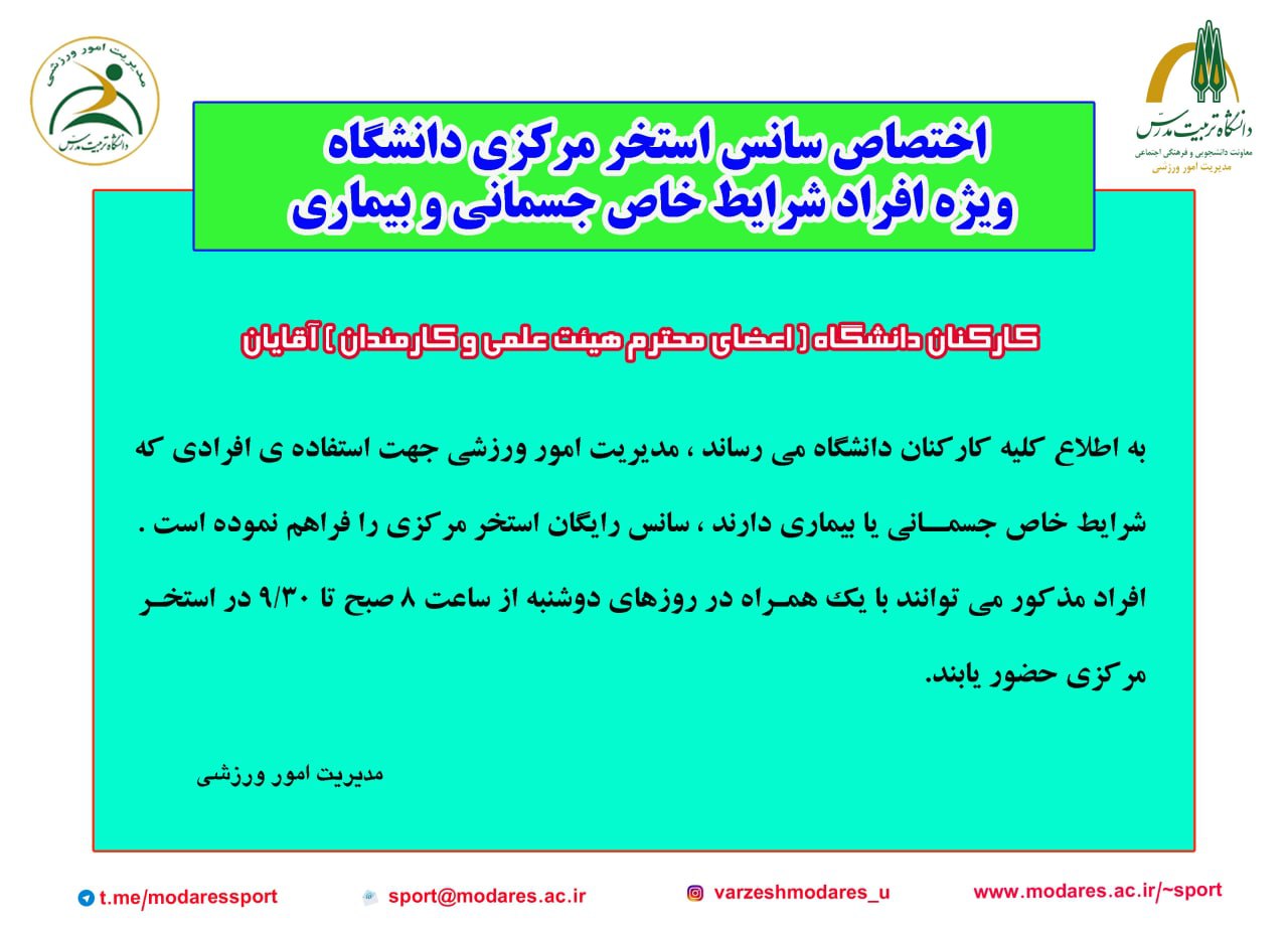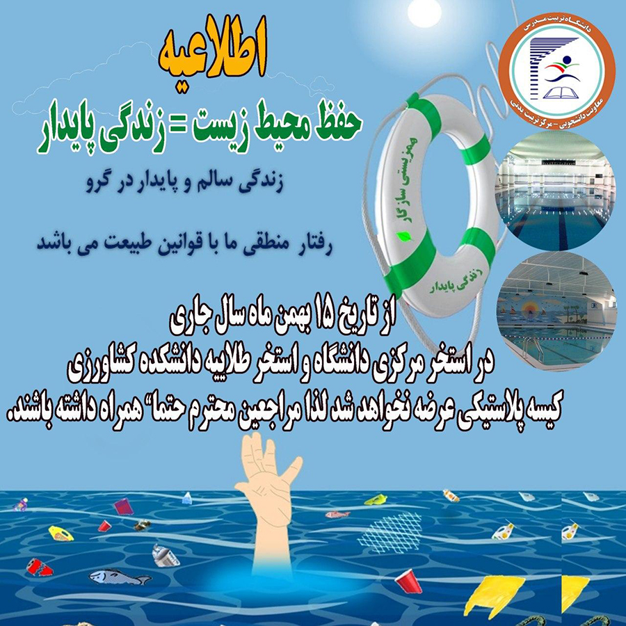 ![]() برگزاری دوره آموزشی شنای مقدماتی ویژه آقایان در استخر طلاییه دانشکده کشاورزیمدیریت امور ورزشی در استخر طلاییه دانشکده کشاورزی وره آموزشی شنای مقدماتی برگزار مینماید. ![]() نتایج نظرسنجی استخر پردیس مرکزینتایج نظرسنجی استخر پردیس مرکزی بازه زمانی ۱۴۰۱/۰۴/۲۲ لغایت ۱۴۰۱/۰۶/۳۱ منتشر شد. ![]() سانس رایگان استخرهای دانشگاه به مناسبت گرامیداشت روز دانشجو (ویژه دانشجویان)مدیریت امور ورزشی دانشگاه، بمناسبت گرامیداشت روز دانشجو ( 16 آذر ) سانس های رایگان ، ویژه دانشجویان اختصاص داده است. ![]() تخصیص سانس رایگان استخر مرکزی دانشگاه به اشخاص بیمار و یا دارای شرایط جسمانی خاصمدیریت امور ورزشی دانشگاه جهت استفاده اشخاص بیمار و یا دارای شرایط جسمانی خاص، سانس رایگان استخر مرکزی در نظر گرفته است. ![]() سانس رایگان استخرهای دانشگاه ویژه دانشجویان در هفته تربیت بدنی و ورزشمدیریت امور ورزشی دانشگاه، به مناسبت گرامیداشت روز تربیت بدنی و ورزش، سانسهای رایگان استخر ویژه دانشجویان در نظر گرفته است. ![]() سانس رایگان استخرهای دانشگاه در هفته تربیت بدنی و ورزش (ویژه دانشجویان)مدیریت امور ورزشی دانشگاه، به مناسبت گرامیداشت روز تربیت بدنی و ورزش (۲۶ مهر) سانسهای رایگان، ویژه دانشجویان در نظر گرفته است. دانشجویان عزیز دانشگاه میتوانند با در دست داشتن کارت دانشجویی طبق برنامه ذیل از استخر مرکزی و دانشکده کشاورزی استفاده نمایند. ![]() مبالغ ورودی استخرهای دانشگاهتعرفههای جدید استخر و برنامه جدید زمانی تا پایان اسفند ماه سال جاری به شرح اطلاعیه تصحیح گردید. ![]() کلاسهای آموزش شنا (ویژه دانشگاهیان) در شش ماهه دوم سال ۱۴۰۱کلاسهای آموزشی شنای استخر پردیس مرکزی و طلائیه دانشکده کشاورزی به شرح مندرج در اطلاعیه تغییر کرد. ![]() برنامه زمانبندی استخر طلاییه دانشکده کشاورزی تا پايان سال ١٤٠١برنامه زمانبندی استخر طلاییه دانشکده کشاورزی تا پايان سال ١٤٠١ ![]() برنامه زمانبندی استخر پرديس مركزی دانشگاه تا پايان سال ١٤٠١برنامه زمانبندی استخر پرديس مركزی دانشگاه تا پايان سال ١٤٠١ ![]() بازدید سرزده رییس دانشگاه از مدیریت امور ورزشی و استخر مرکزی دانشگاهدکتر فرهاد دانشجو رییس دانشگاه ، ظهر امروز شنبه ۲۲ مرداد ماه به صورت سرزده از مدیریت امور ورزشی و استخر مرکزی دانشگاه بازدید کرد. ![]() بازگشایی مجدد استخر پردیس مرکزی با حضور مسئولان دانشگاهبا حضور و بازدید دکتر خدایار معاون توسعه منابع وسرمایه انسانی و دکتر دردائی معاون دانشجویی و فرهنگی_اجتماعی دانشگاه، مجوز بهرهبرداری مجدد استخرهای دانشگاه صادر شد. ![]() عدم عرضه کیسه پلاستیکی در استخر مرکزی و استخر طلاییه در راستای حفاظت از محیط زیستحفظ محیط زیست = زندگی پایدار ![]() برنامه استخر مرکزی دانشگاه از ۹۸/۰۷/۰۱ لغایت ۹۸/۱۲/۲۸ (نیمه دوم سال ۹۸)روزهای جمعه فعالیت مجموعه استخر از ساعت ۱۳:۳۰ تا ۲۱:۰۰ و ویژه آقایان است. ![]() شروع به کار استخر طلاییه دانشکده کشاورزیاستخر طلاييه دانشكده كشاورزی از امروز سه شنبه ١١ تير ماه برای استفاده علاقمندان داير میباشد. ![]() برنامه استخر مرکزی دانشگاه از 25 خرداد لغایت 17 شهریور 1398 (فصل تابستان) منتشر شدروزهای جمعه فعالیت مجموعه استخر از ساعت 13:30 تا 21 و ویژه آقایان است. ![]() تعطيلی استخر مركزی دانشگاه از 5 تا 7 خردادماهاین تعطیلی بدلیل مقارن شدن فعالیت مجموعه با لیالی قدر میباشد. ![]() برنامه استخر مرکزی دانشگاه تا 15 اردیبهشت منتشر شدبرای کسب اطلاعات بیشتر با شماره 82884226 در تماس باشید. ![]() استخر طلاییه دانشکده کشاورزی روز چهارشنبه هفتم آذرماه تعطیل استوجود مشکلات فنی باعث تعطیلی استخر شده است. ![]() برنامه زمان بندی استفاده از استخرهای دانشگاه در نیمه دوم سال 97برنامه دو استخر، پردیس مرکزی و طلاییه دانشکده کشاورزی معین شد. ![]() برنامه زمان بندی استفاده از استخر طلاییه دانشکده کشاورزی دانشگاه در نیمه دوم سال 97 منتشر شدسانس آزاد ویژه دانشجویان، کارکنان، اسا